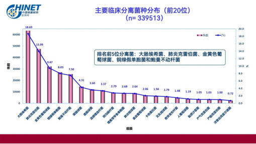 CHINET中国细菌耐药监测结果(2022年1-12月)显示,铜绿假单胞菌在主要临床分离菌种分布中排第四。