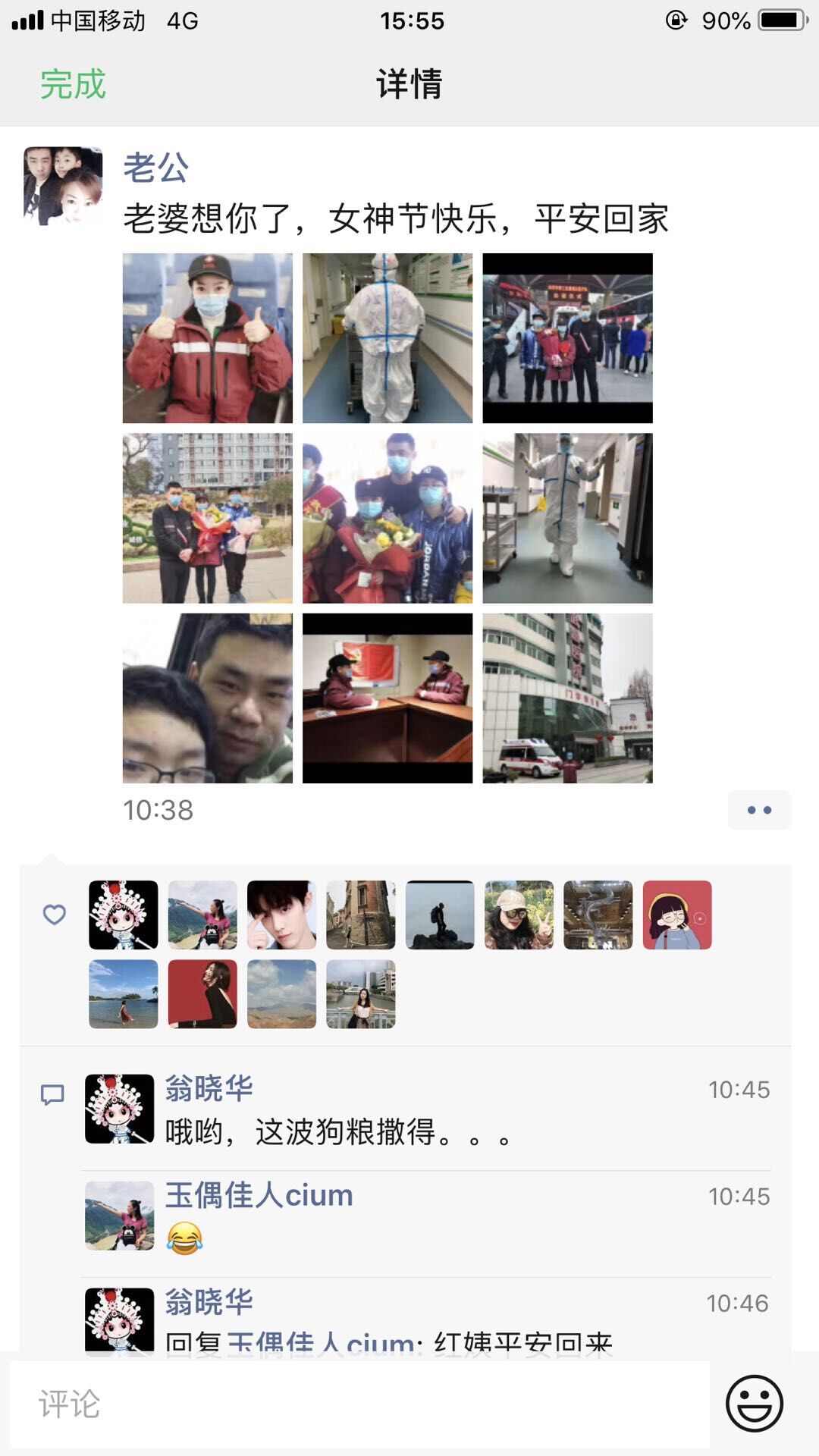 对我来说,今天是一个特别的女神节,我老公第一次发朋友圈,第一次对我说:“想你了!”我的宝贝儿子还指定造型让我拍了一张照片,后来才知道,他是想要通过一种特别的方式送我一束鲜花。今天我还被评为战地樱花,对我来说真的是充满了惊喜的一天。内心激动的我,想起了远在自贡的我的两位母亲。我来到武汉后,她们还要帮我照顾家里的两个男子汉,真的很辛苦。在这里,我想真挚的对两位母亲说:“妈妈,辛苦了,女神节快乐!”