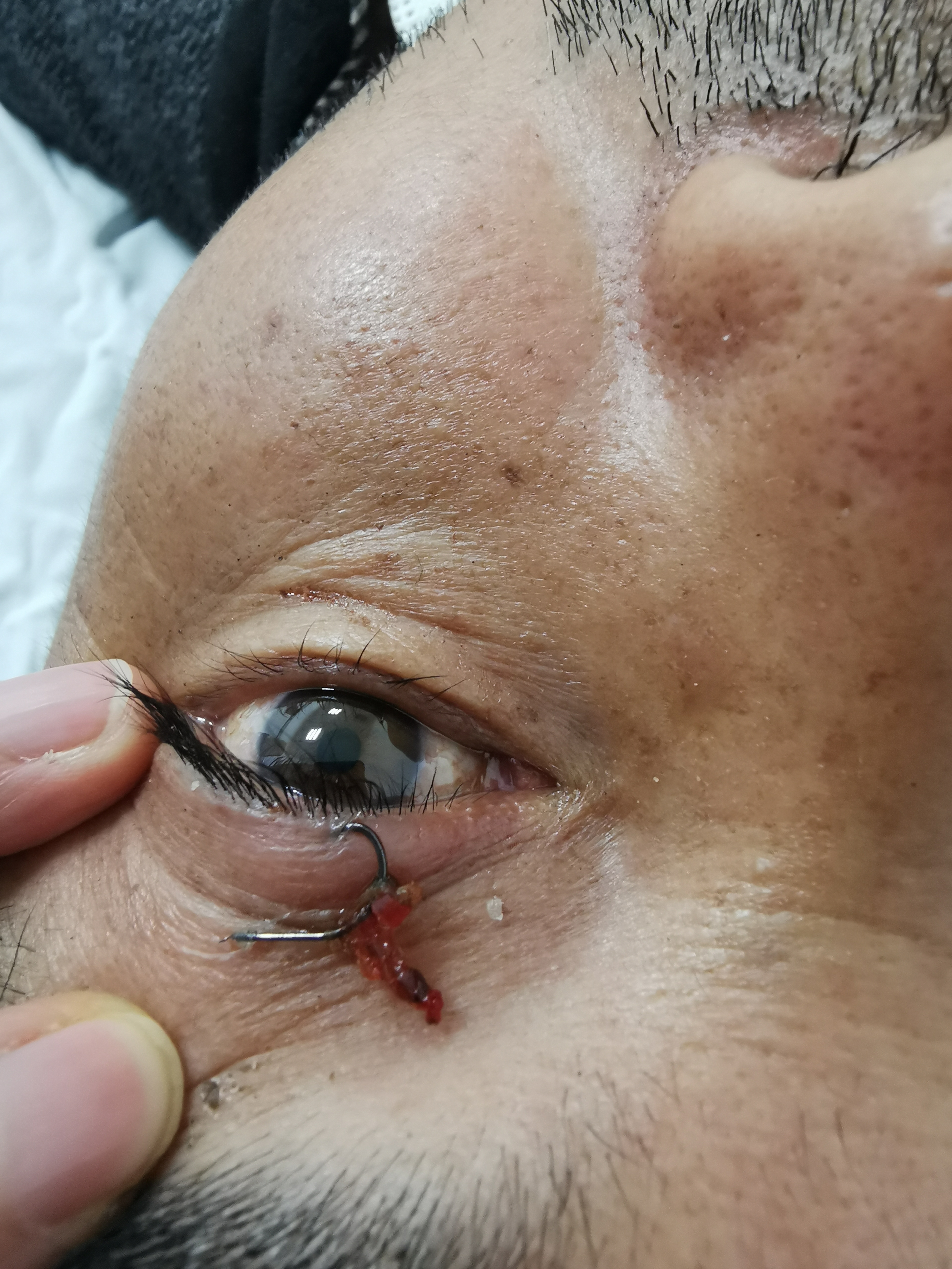 一阵急促的脚步声响彻了眼科急诊室的楼道,自贡市第三人民医院眼科来了一位特殊的患者,一位被鱼钩钩住眼皮的男子。该男子在钓鱼时不甚被弹起的鱼钩钩住了眼皮,鱼钩扎进了上眼睑的皮肤,距离睑缘仅2mm,离眼球的位置也很近。经过仔细的检查后,眼科医生孙林帮助患者顺利取出了鱼钩,且视力没有受损。