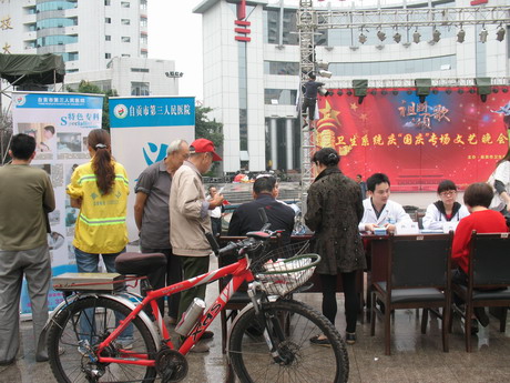 9月28日下午2:30分,自贡市三医院组织医务人员参加了市卫生局在春华广场举行的大型义诊活动,医务人员热情为前来咨询的群众耐心讲解,进行疾病预防及健康保健知识指导,免费看病和测量血压,发放就医指南等,受到群众好评,医务人员们以特有的方式迎接祖国母亲的生日。