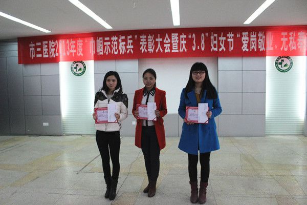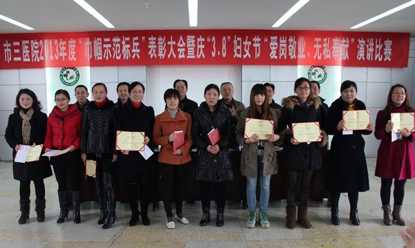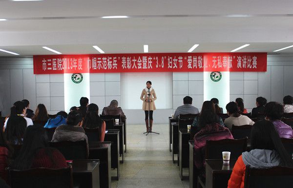 3月5日下午,自贡市三医院在医院报告厅举行了2013年度“巾帼示范标兵”表彰大会暨庆“三八”国际劳动妇女节“爱岗敬业,无私奉献”演讲比赛。