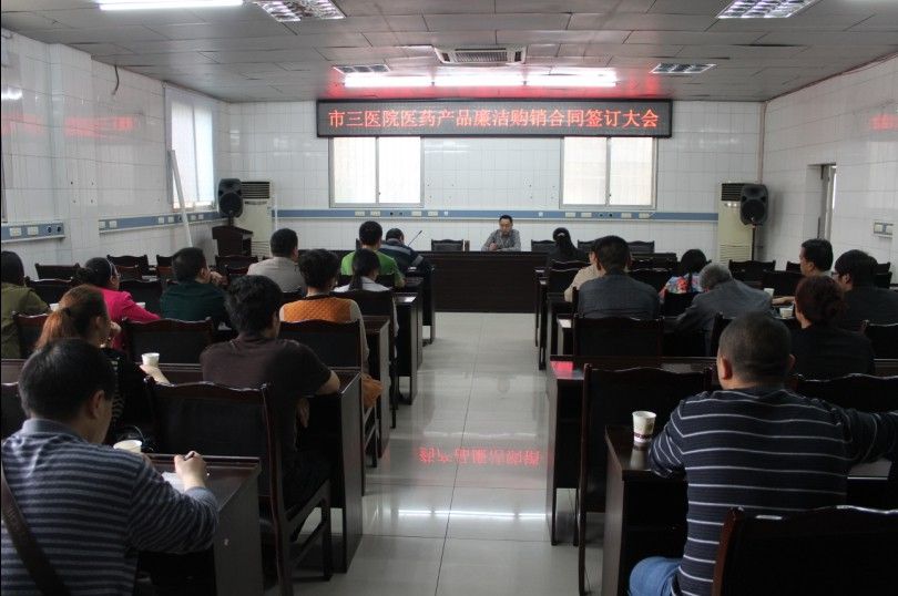 为贯彻落实《国家卫生计生委办公厅关于落实医药购销领域商业贿赂不良记录规定有关工作的通知》(国卫办药政函[2014]163号),进一步加强医疗卫生行风建设,规范医药购销行为,切实纠正医疗行业不正之风,适应新形势下公立医院改革和医院廉洁防控工作需要,2014年4月11日下午,自贡市三医院约谈所有药品供应商集中签订了《医疗卫生机构医药产品廉洁购销合同》。