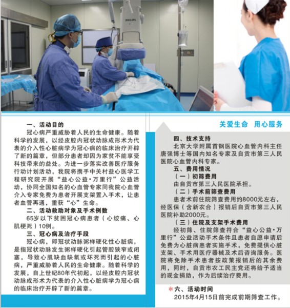 如果您正患心绞痛,或有过心肌梗死,因家庭贫困无力求医,现我院正携手“益心公益·万里行”项目开展医疗救助活动,您可免费在我院门诊进行初查,如果符合活动规定的手术条件,我们将免除手术支架、球囊及一定的医疗费用,让您血管再通,重获新生,详情请致电了解。
