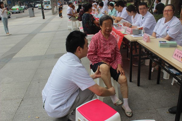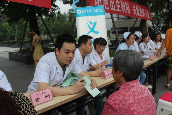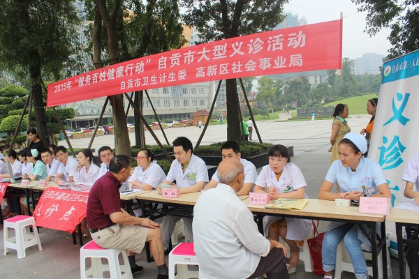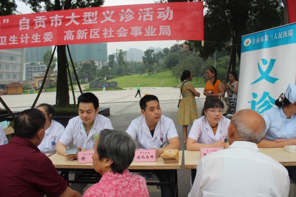 9月15日上午,由市卫生计生委和高新区社会事业局联合举办的2015年“服务百姓健康行动”自贡市大型义诊活动在汇东公园举行。市三医院积极参与,派出消化内科、肾病科、骨科等专业医疗专家参加了义诊活动,现场为前来健康咨询的群众解疑答惑,并免费发放了夏桑菊、板蓝根等清凉药品,受到群众好评。(sml)