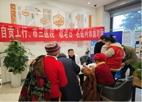 为切实发挥“医银”党建结对共建作用,落实自贡市2024年民生实事“百场义诊活动”,进一步推动医院党建融合医疗服务“走出去”,12月16日上午,自贡市三医院联合中国工商银行贡井支行,在工行营业厅开展了“‘敬老日’名医问诊面对面”群众健康服务活动。