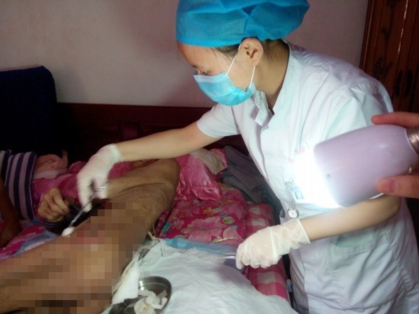 下午五点半下班后,下班的人们都忙着买菜回家准备晚餐。几个穿着白大褂,带着无菌盐水、棉签、敷料的白衣天使们却匆匆赶往贡井区雷公滩某厂宿舍,原来,她们是自贡三医院的医务人员,前往唐大爷家为老人做压疮护理管理。