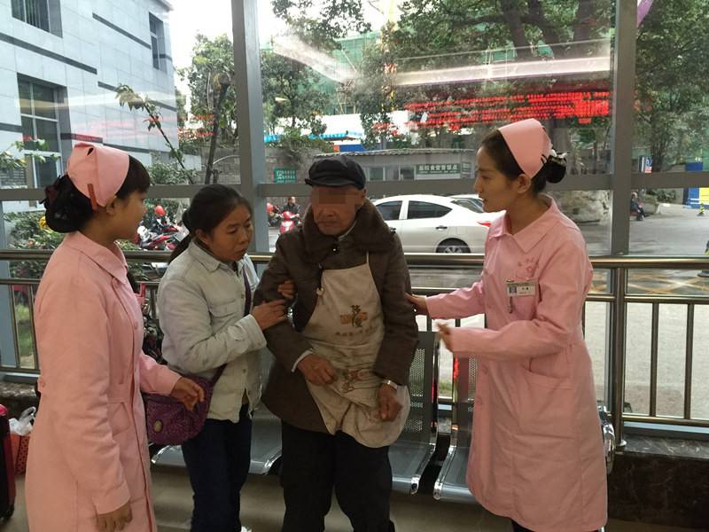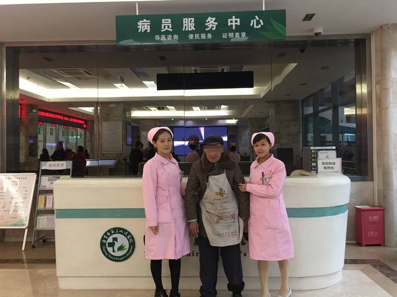 得到这个好消息,她们带着杨大爷来到心血管内科,可却没有找到人。原来,郑婆婆确实于今年10月份在医院心血管内科治疗过,但早已出院。“可能是在市一医院。”突然说话的是送老人来院的摩托车司机张师傅,老人说要去贡井一医院,又坚持说是去贡井,就把他送这儿来了。于是,工作人员又打电话到市一医院心血管内科询问,终于找到了郑婆婆。担心杨大爷走丢,加上身上放着许多现金不安全,最后联系婆婆的陪护阿姨到医院来接走了老人。