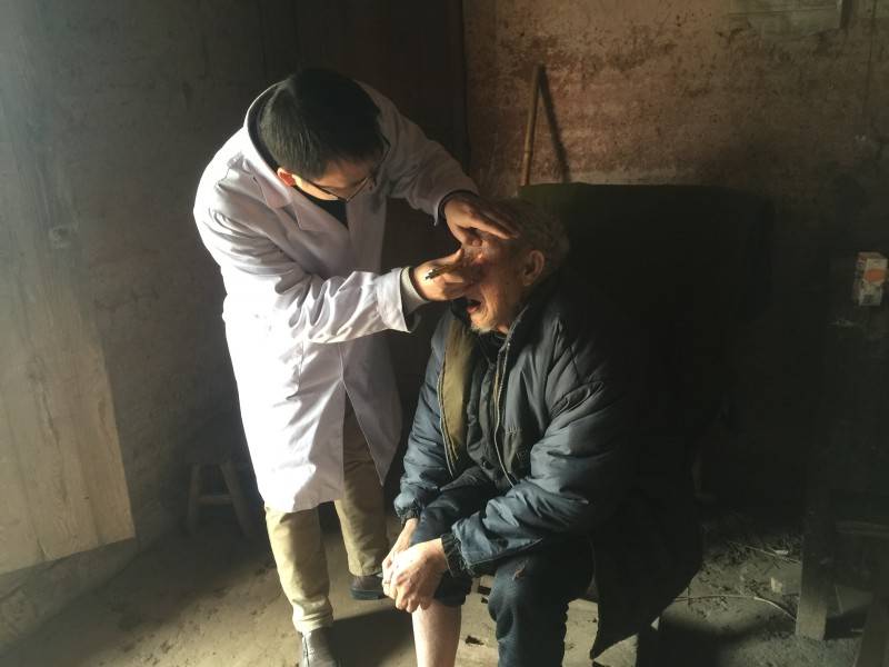义诊活动结束后,医疗服务队随即赶往新民村2组90岁老党员兰永川家中访视。今年春节前夕,得知老人行动不便,医院党政主要领导赶到其家中看望慰问,将老人的健康状况牵挂在心。经专家检查,发现老人双眼患有白内障,但由于老人不能平躺,身体状况暂不适合手术。