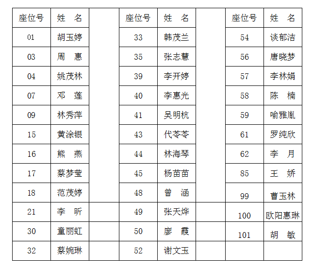 根据护理理论知识考试及面试结果,请以下人员于2019年12月17-18日(下周二—周三)上午08:00,携带个人身份证、二寸免冠白底照片2张、体检费约500元,空腹、近视者请带好眼镜,到自贡市第三人民医院西区健康管理中心进行体检,合格后进入医院护士规范化培训,名单如下:
