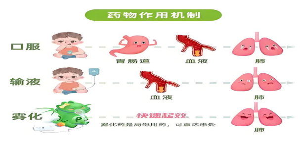雾化吸入,简单来说,就是将药物通过雾化装置变成微小的雾滴或微粒,通过吸入的方法作用于呼吸道和肺部,使药物能够快速、有效地发挥作用。对于儿童而言,这是一种常见且有效的治疗呼吸道疾病的方法。与口服或注射药物不同,雾化治疗直接将药物送达患病部位,不仅能提高药物的疗效,还能减少全身不良反应。
