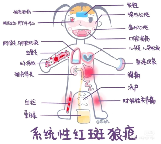 攻击皮肤则导致面部“红斑”及皮疹、脱发、光过敏;