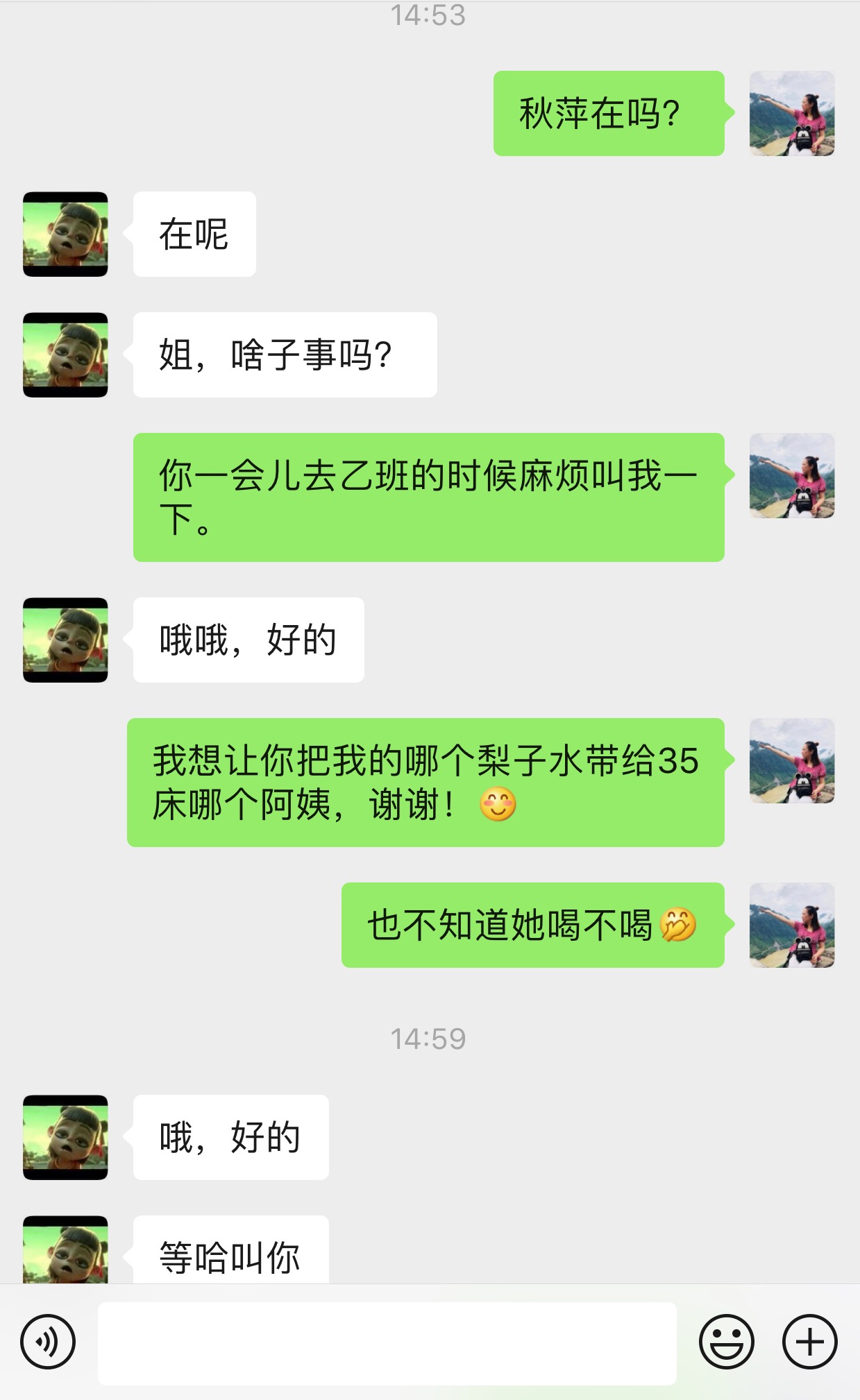 梨汤熬好后,我第一时间在队员群里告诉大家可以来喝。聊着聊着我想到了医院35床的那位阿姨,阿姨来自福利院,双下肢截瘫,我也不知为什么脑海里总是想到她。正好住在我隔壁的是下一个班口的同事,我便打包了一份,请同事为35床的阿姨带过去。不知道阿姨会不会喜欢,但希望能为阿姨带去一点温暖。