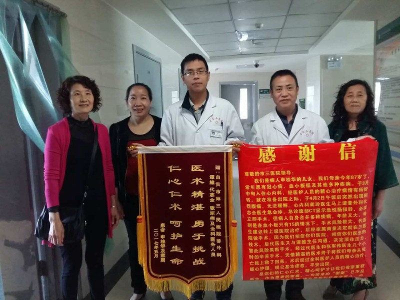 原来,前不久86岁的申婆婆因心累、气促加重入住市三医院心血管内科,经治疗后病情平稳,不料将出院前一天中午进食后不久突发肛门坠胀、疼痛剧烈,看着年迈的母亲疼痛难忍的样子,家属焦急万分、束手无策。医务人员立即为患者行相关检查并急会诊后转入普外科治疗。根据患者病情需手术治疗,但患者患有冠心病、高血压Ⅲ级及40多年的“血小板减少症”等多种疾病,入院后查血小板多次处于危急值,凝血功能异常,存在手术禁忌症,手术风险巨大。但不做手术随时也有生命危险,考虑到患者的安危,转上级医院治疗为好。但家属考虑到患者年事已高不能舟车劳顿,一大家子经过深思熟虑后决定不转院,表示信任三医院,希望就在三医院手术,若出现任何风险后果,家属承担一切责任。面对家属的信任,普外科主治医师代志全、张军伟放下心中担忧,在科主任谭维的积极指导和支持下,精心制定手术方案,勇闯难关,成功为命悬一线的申婆婆实施了剖腹探查+肠粘连松解+小肠部分切除术,术后普外科与心血管内科医务人员密切配合,对症治疗、精心护理,申婆婆治愈出院了,家属万分感谢,把饱含谢意的感激之情写成表扬信和锦旗送到医务人员手里。