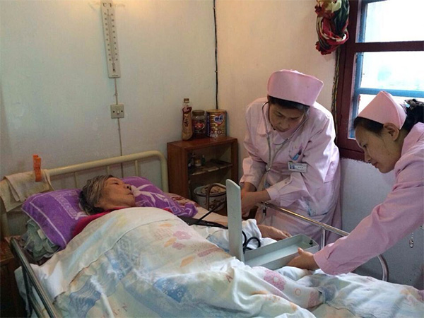 一年前,朱婆婆因突发大面积脑梗死,住院半年,几次死里逃生,终于在神经内科医护人员的精心治疗和护理下顺利出院。但由于神经功能缺失,留下了残疾,一侧肢体瘫痪。前不久,医护人员电话回访,其女儿谈到朱婆婆有尿频尿急的症状,怀疑是尿路感染。第二天,神经内科延续服务小组成员周霞主治医师、胡丽萍护士长、黄显群主管护师带着血压计、血糖仪、听诊器、留取小便的器材等,冒着大雨前往其住所。