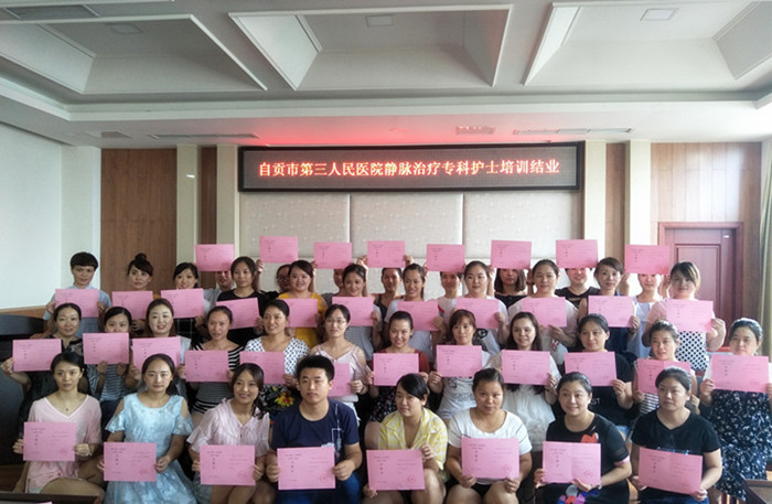 在为期2个月的培训学习中,学员们积极踊跃参加理论学习、操作实训,最后通过考试考核,41名学员全部结业,其中有28名护理人员以优异成绩获得医院颁发的《自贡市第三人民医院静脉专科护士培训合格证书》。