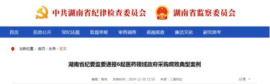2024年12月30日,湖南省纪委监委通报了“6起医药领域政府采购腐败典型案例”,其中包括一起检验科主任被查事件。