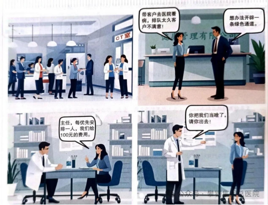 就医秩序关系患者就医体验感、获得感和幸福感,挂号、预约、候诊是就医最正常不过的流程,本是患者就医普遍遵循的准则。然而,一些健康管理公司为了提升客户满意度,通过拉拢腐蚀医院工作人员优先安排检查,严重破坏公平的就医秩序。