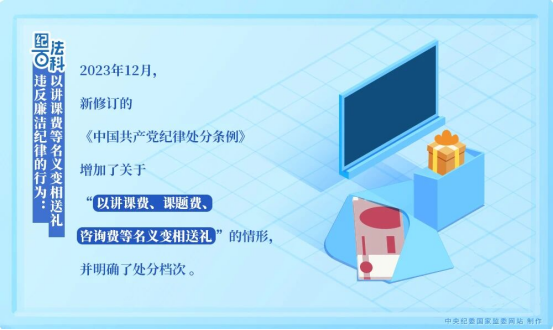 执纪监督中发现,现在送礼的手段升级、花样翻新,隐形变异行为潜滋暗长,其中以讲课费、课题费、咨询费名义变相送礼、拉关系的比较典型。除此以外,也存在其他变相送礼的情形,因此本款还规定了“等名义”,以涵盖更为周延。本条主要是针对违规送礼行为的规制,但“送”和“收”存在对应关系,对于以讲课费、课题费、咨询费等名义变相收礼的,也要给予相应处分。